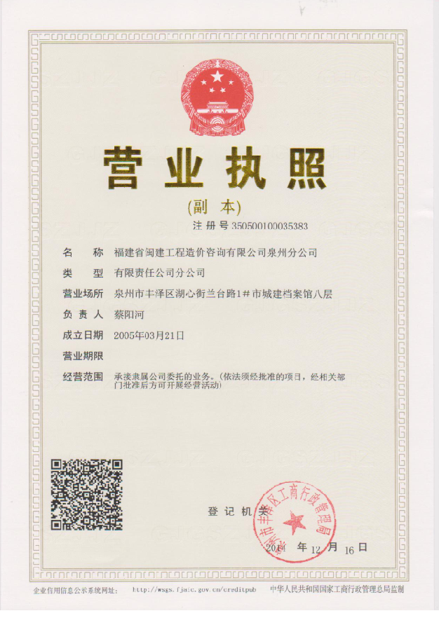 泉州分公司系天辰平台网址链接在泉州设立的独立核算的分支机构,成立于1995年,办公地址位于泉州市湖心街兰台路1号泉州城市建设档案馆8楼,分公司现有办公场所面积110m2,分公司现有专职人员20人,其中:招标代理人员3人,造价专职咨询人员17人;高级职称4人、中级职称5人;注册造价师4人、造价员8人;。
